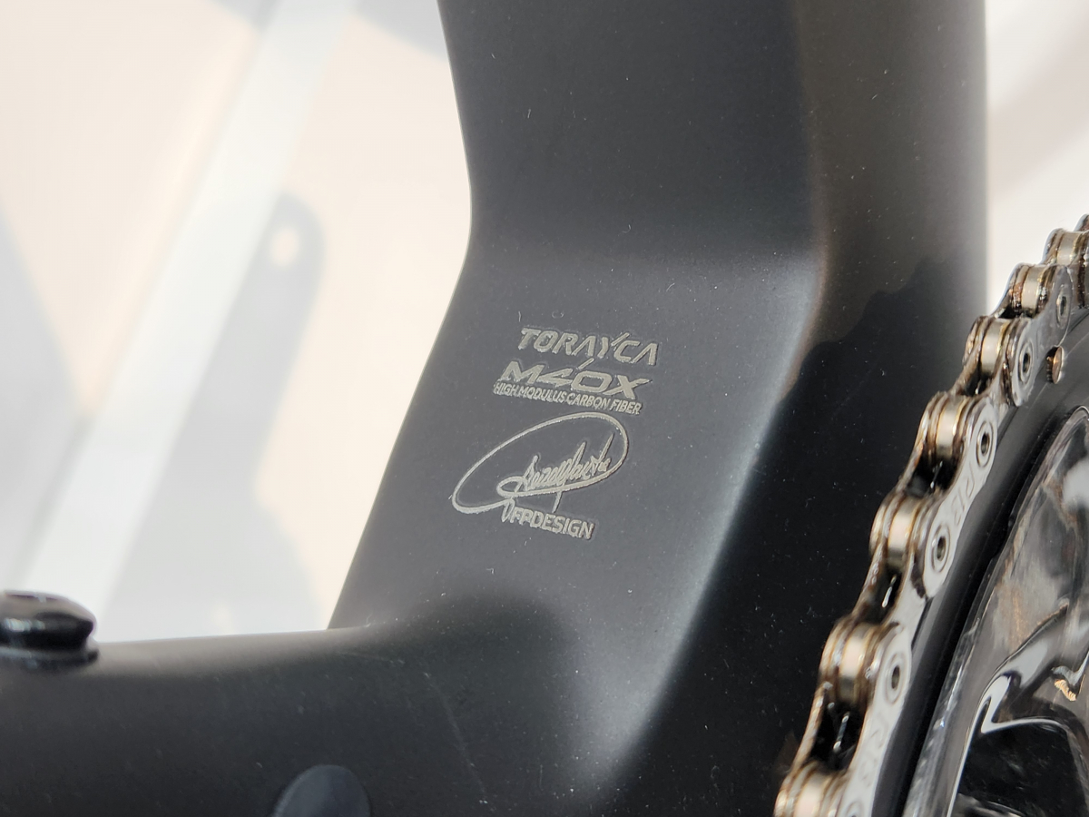 ノーマルの仕様ではゴールドにペイントされるロゴですが、このフレームに合わせて特別にガンメタルブラックにペイントされています。