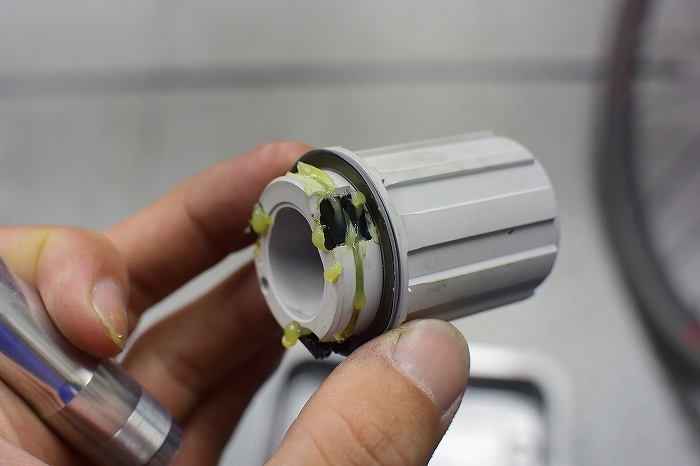 カンパの場合は内部が古いグリスで真っ黒になるか、グリスが乾いてカラカラになっていることが多いです。