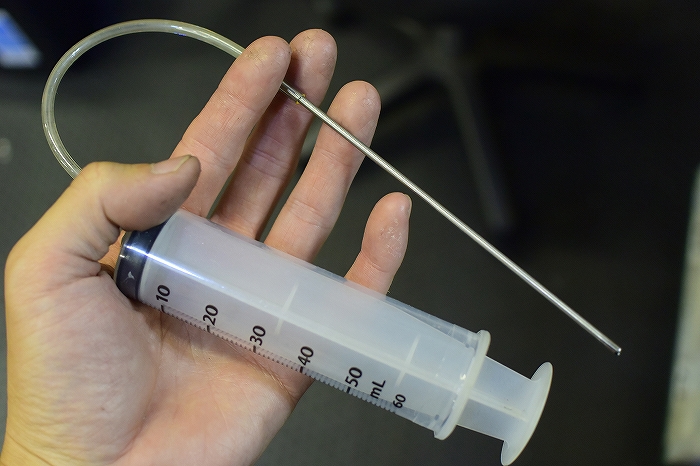 ⑧タイヤ内に残ったマクハル液を専用注射器でヌキトル