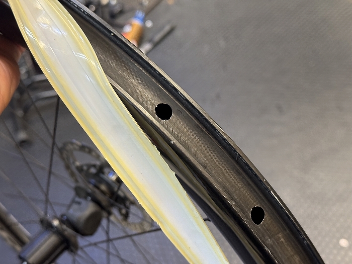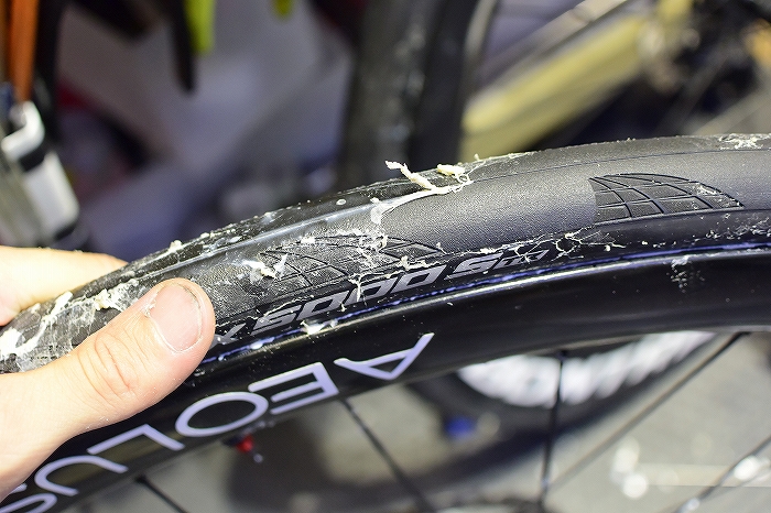 チューブレス(レディ)タイヤには空気漏れを防ぎ、パンクも防止してくれる「シーラント」という液体をタイヤ内に注入します。