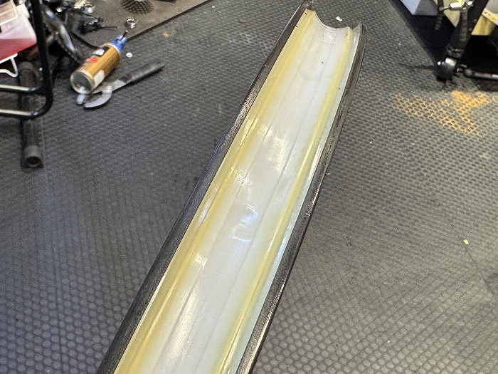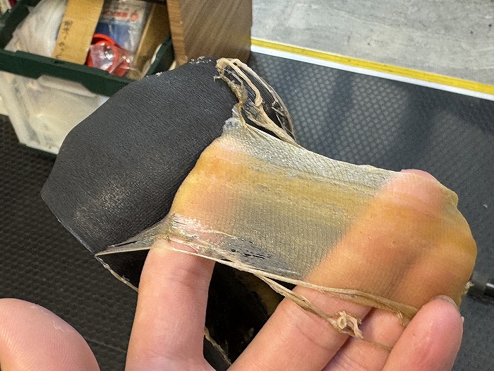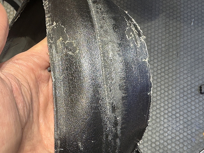 パンク後にシーラントを追加したからか、分厚い膜ができています。