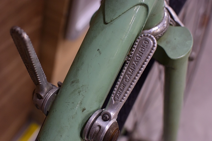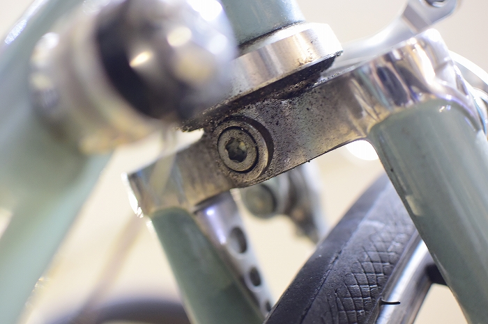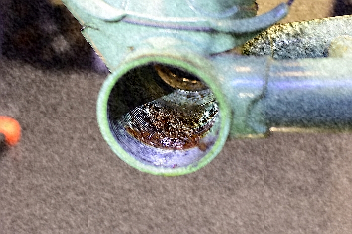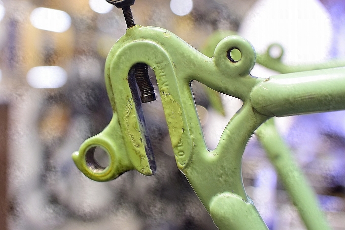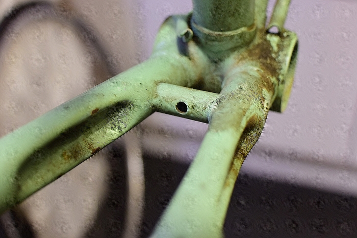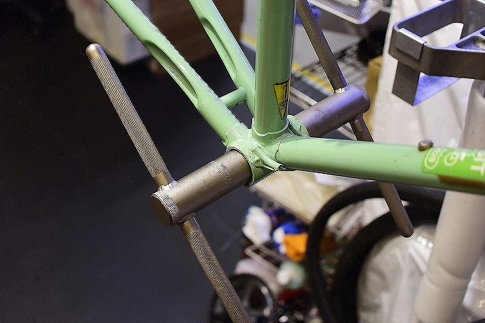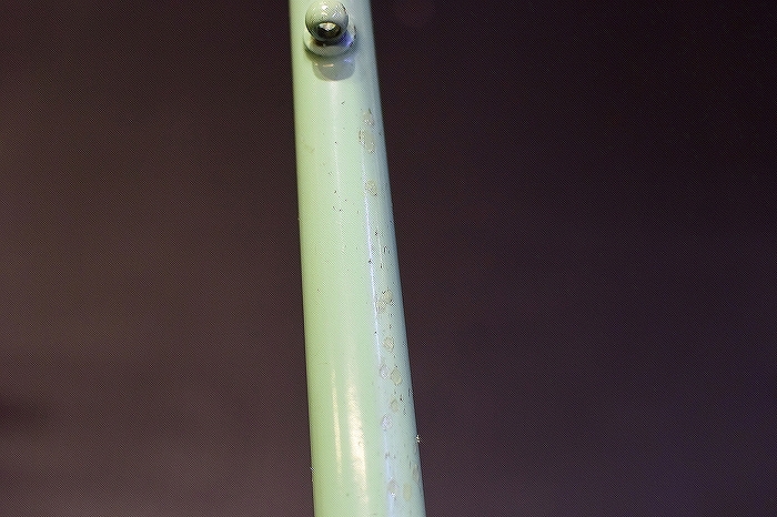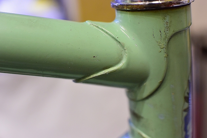 写真右側、ヘッドチューブが水色っぽい塗料で修正してあるのは元々です。昔から大切にしていたんですね。
