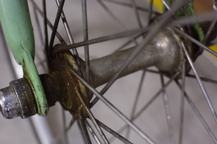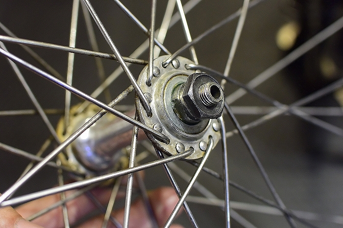 ちなみに最近の自転車と比較。古いものはナットが飛び出しています。