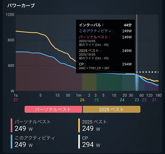 パワーカーブ。黄色が2025のベスト、青が今回のデータ。