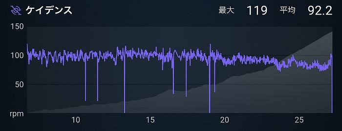 序盤のアップダウンでペースの変化が激しく、(休んでいても)予想以上に踏んでしまっている上に、高負荷で踏むと足に違和感があるので自然とケイデンスが高まり、心肺に負荷がかかっているのかもしれません。