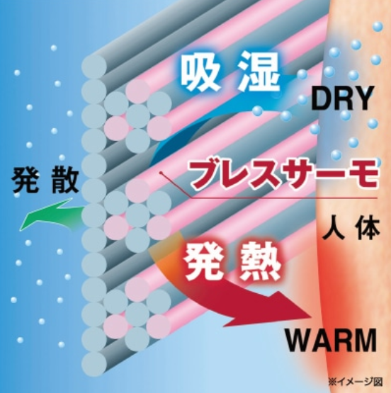 もはや説明もいらないくらいの市民権を得ているブレスサーモですが、あえて一言で言うと、吸湿発熱ウェアの先駆けです。