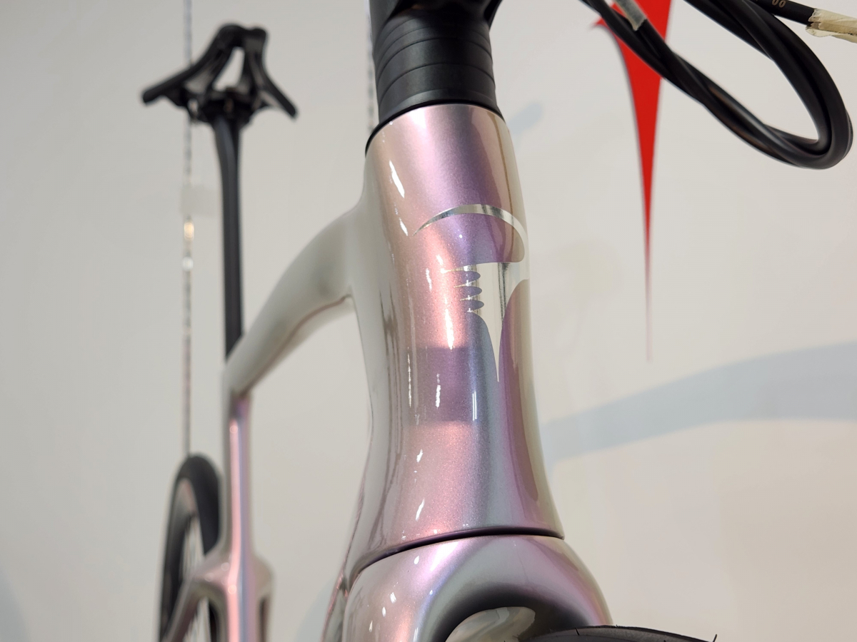 ダウンチューブ上部とリアトライアングル、フォークの内側部分のみ別のカラーをさりげなく見せる『EDGE』という現行の『DOGMA F』に多く使用されるペイントスキームと近い配色となっており、洗練された仕上がりになっています。