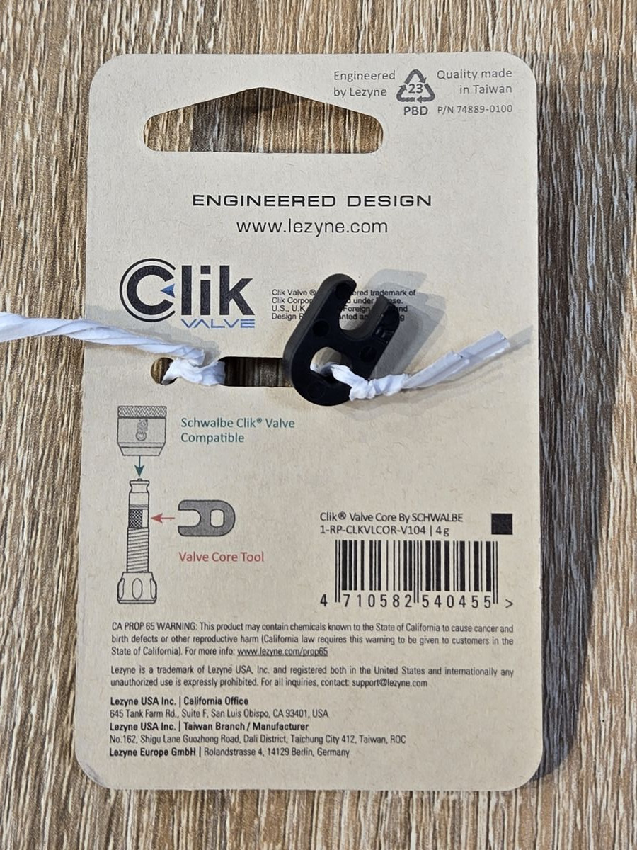 仏式用のCLIK VALVE2個、バルブキャップ2個、コア回し工具に加えて、英式バルブ用CLIK VALVEコア2個が付属しています。英式バルブ用コアは、日本の代理店はもちろんCLIK VALVE公式サイトでも販売していない?けっこうレアなアイテムかもしれません。