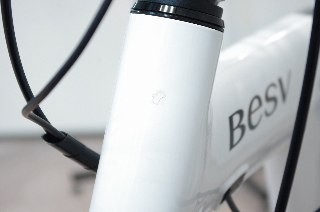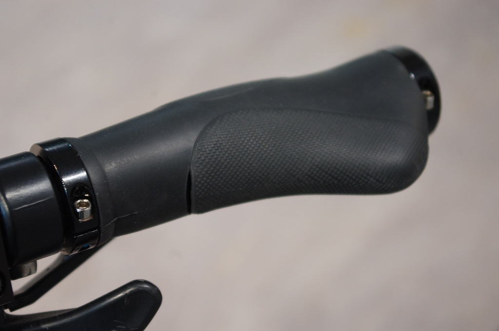 ただし、試乗車として3年間使用していた自転車ですから、多少の傷・部品の消耗などはありますので、ご来店の上実車をご確認下さい。目立つところは、ヘッドチューブの塗装欠け(腕に覚えのある方はご自身で補修してみてはいかがでしょうか)、グリップのヒビ割れなど。