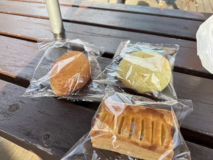 道の駅のパン屋さんでカレーパン、メロンパン、ブルーベリーパイをゲット。