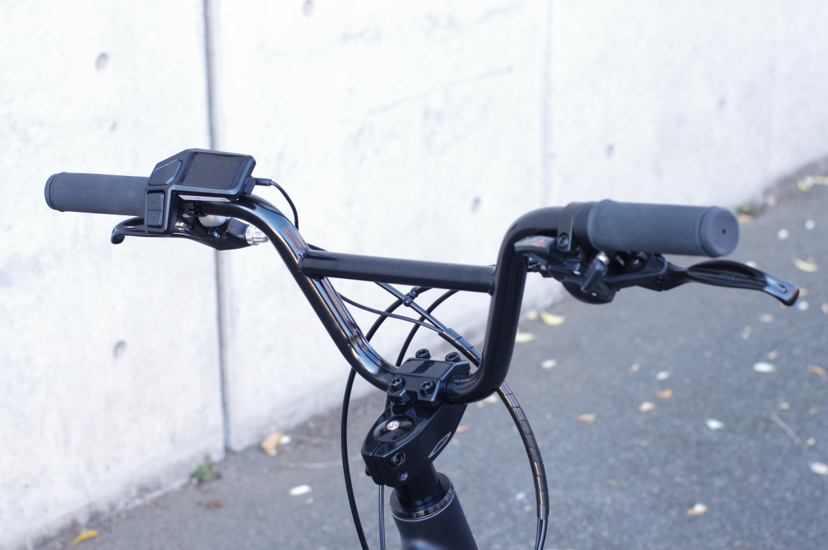 ハンドル高はLIMITEDカラーモデルに採用されているショートステムに近い高さです。グリップが少し狭いのですが、その代わりハンドル幅は600mm以内(「普通自転車」の基準)におさまっています。