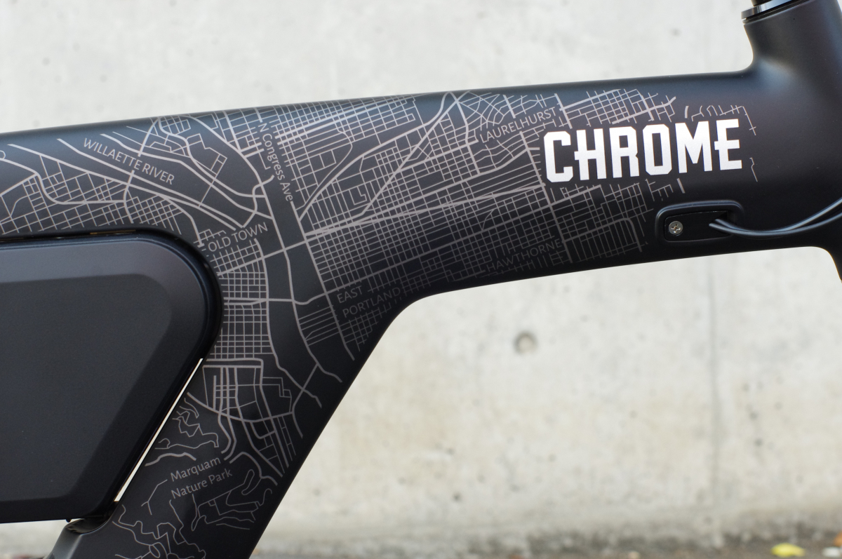 マットブラックのフレームにはポートランドの地図が描かれています。「BESV」のロゴはいつもならモデル名が入る場所に引っ越し、「CHROME」ロゴに定位置を譲っています。