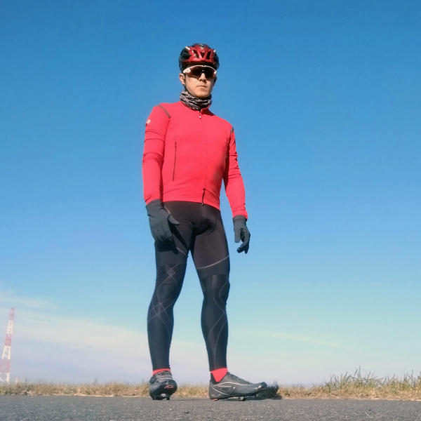 赤いジャケットでしたので、手持ちの物からヘルメット、サングラス、ソックスを同色に、ネックウォーマー、グローブ、シューズをグレー系で合わせました。