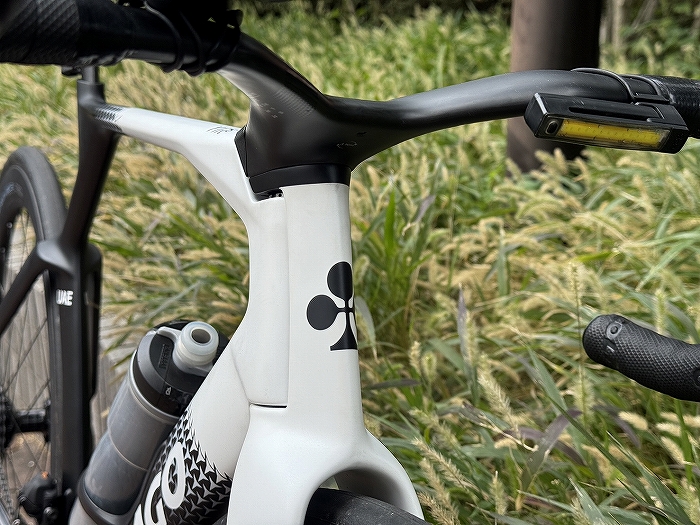 軽量フレームですがエアロもしっかり考慮されていて、フル内装、ステム一体エアロハンドルを装備。