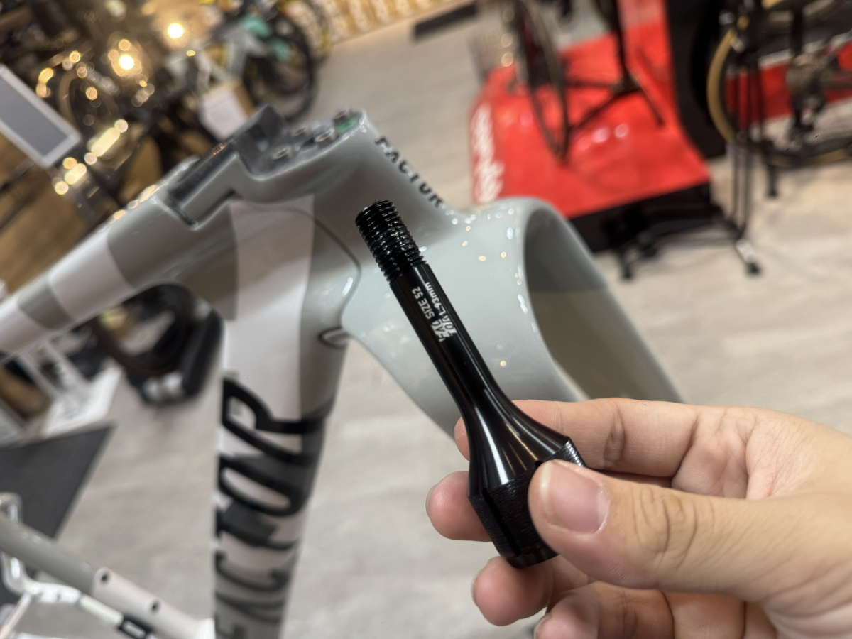 このようなパーツをフォーク下部から差し込み、上から受けのパーツとネジで締め込むことでヘッド部分に圧をかけます。