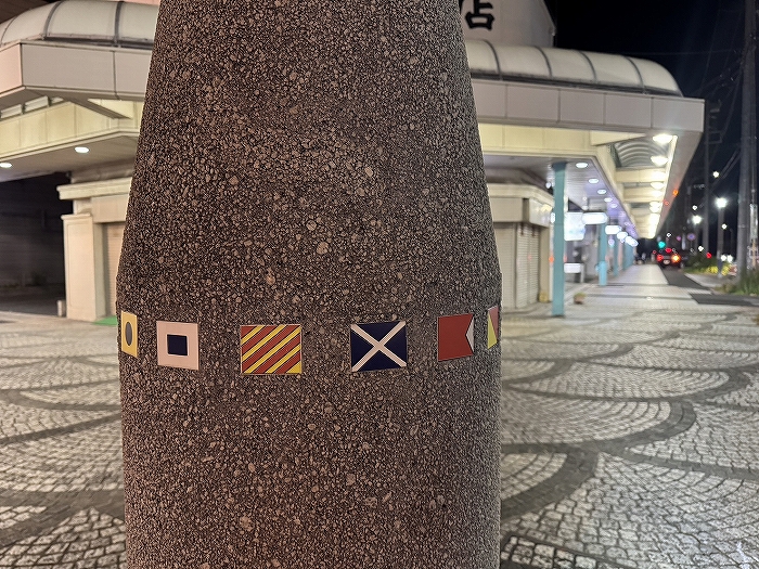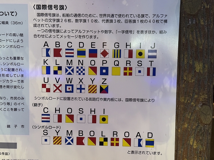 電柱などには信号旗のデザインが。これは何か意味があるはず!帰ったら調べよう!