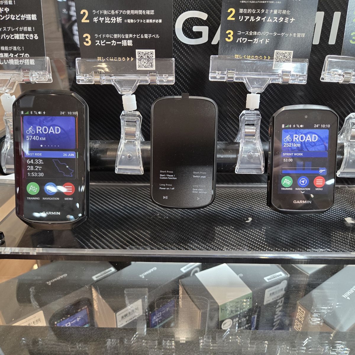 左がGARMIN「EDGE 1050」、中央が「BSC100MAX」、右がGARMIN「EDGE 550」です