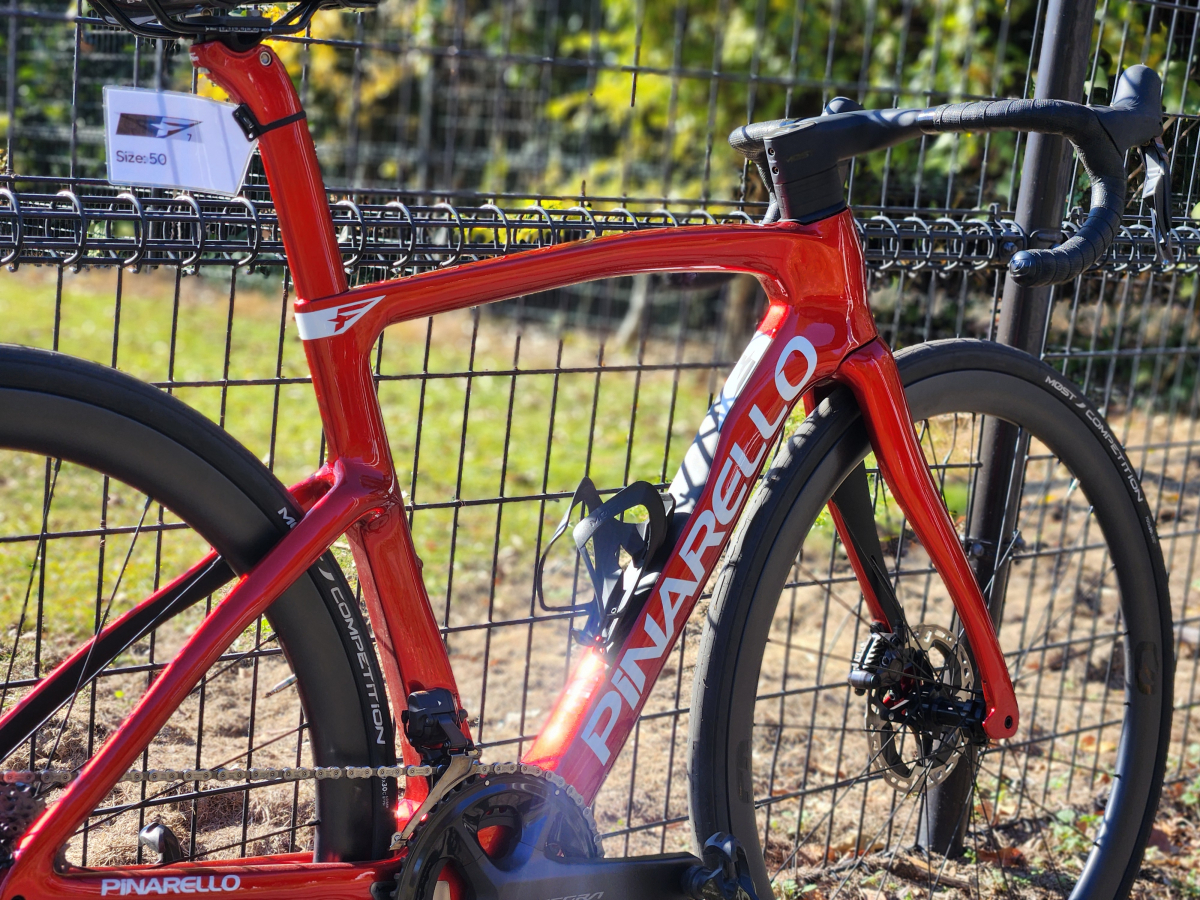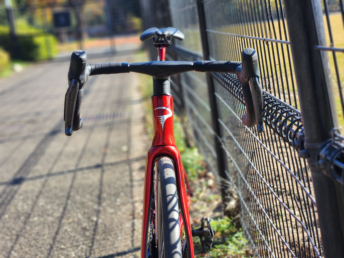 タイヤクリアランスが広がり、ホイールベースが伸たことにより、直進安定性やコーナリングの安定感が増すと、悪くなりがちなレースバイクらしい反応性の良さを壊すことなく、レース屋のピナレロらしく、前作よりも、反応がよくハキハキとしたハンドリングに感じます。