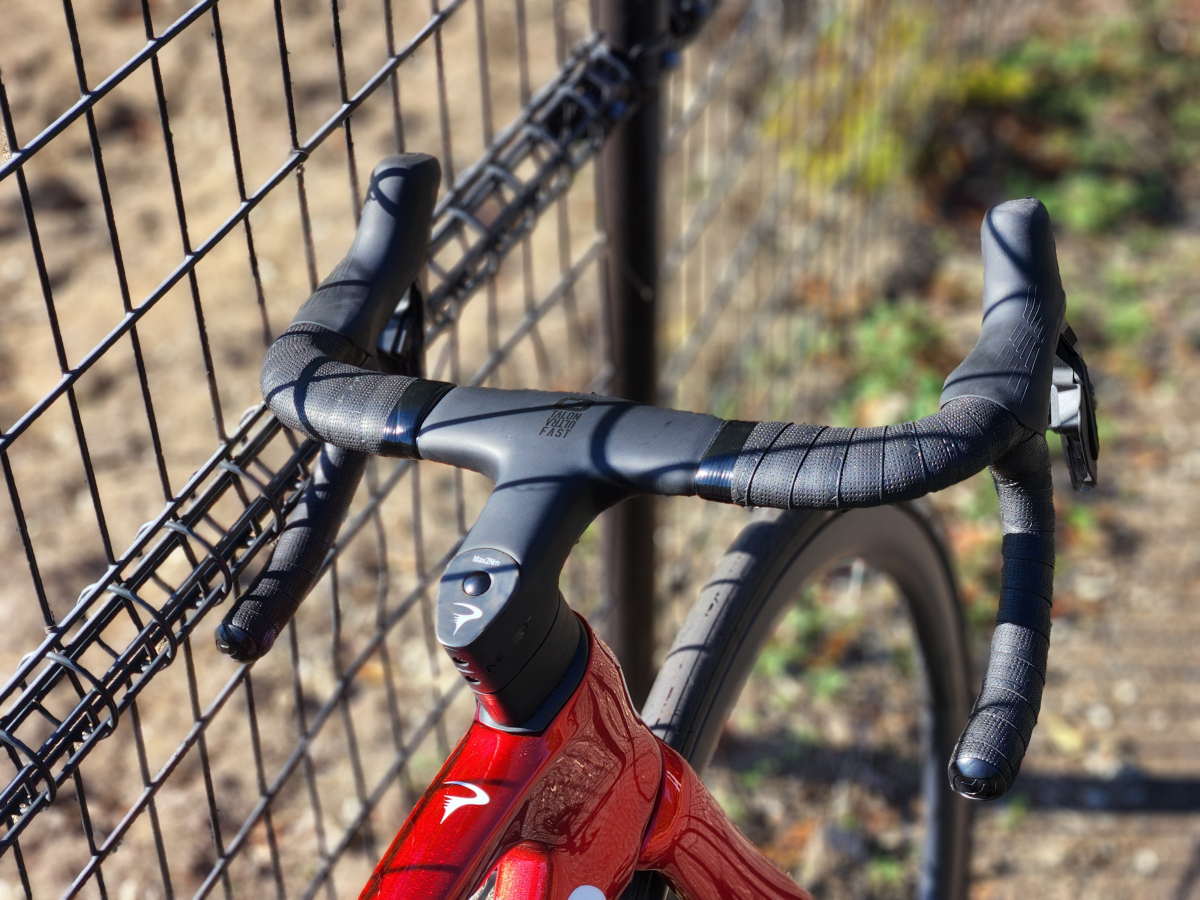 新型になったハンドルのフレア化により、ブラケット部分のハンドル幅が全体的に狭くなり、それによる反応の良さも感じるのですが、狭くなりすぎると感じるダンシングの際やカーブの際にハンドル操作がピーキーになる感覚もなく、思ったとおりにコントロールすることができます。