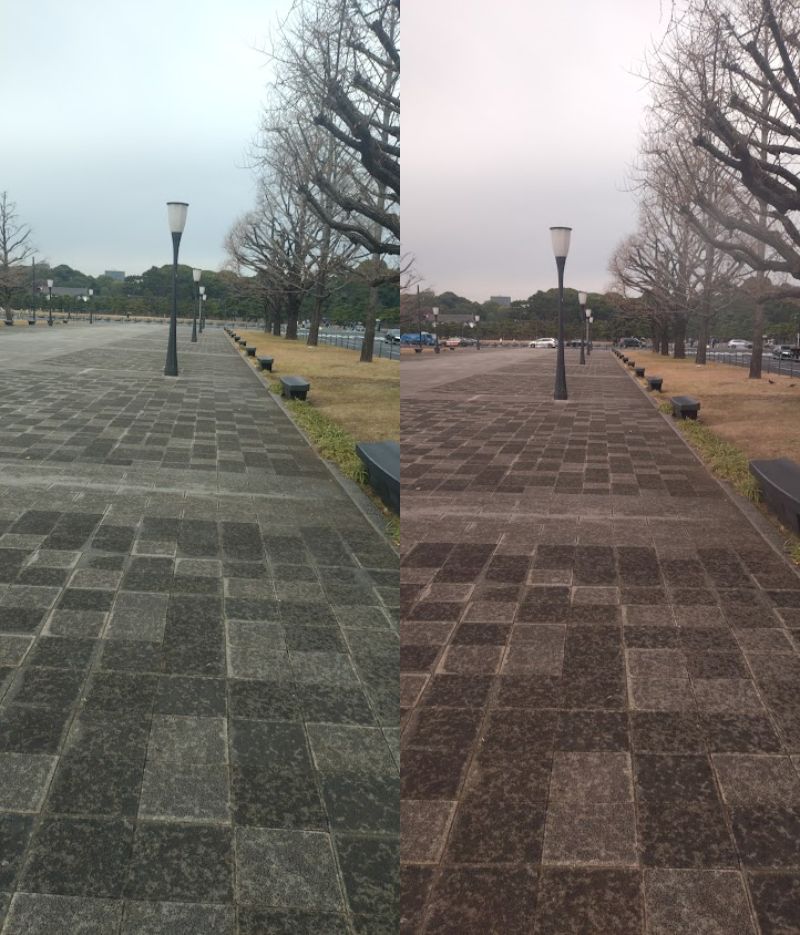 レンズカラーは少し赤みがかっており、アスファルトが見やすいレンズとなっています。アルタリストのレンズは非常によくできているので、有名ブランドであれば、倍以上の値段のレンズと同じような