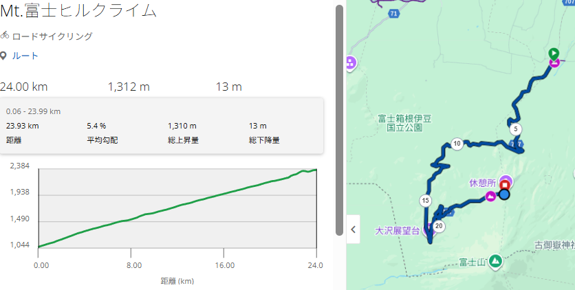 距離25km 標高差 1,270m と、ヒルクライムの中でも長いコースですが、平均勾配5.2%、最大7.8%と全体を通して緩めで激坂もなく走りやすいコースです。