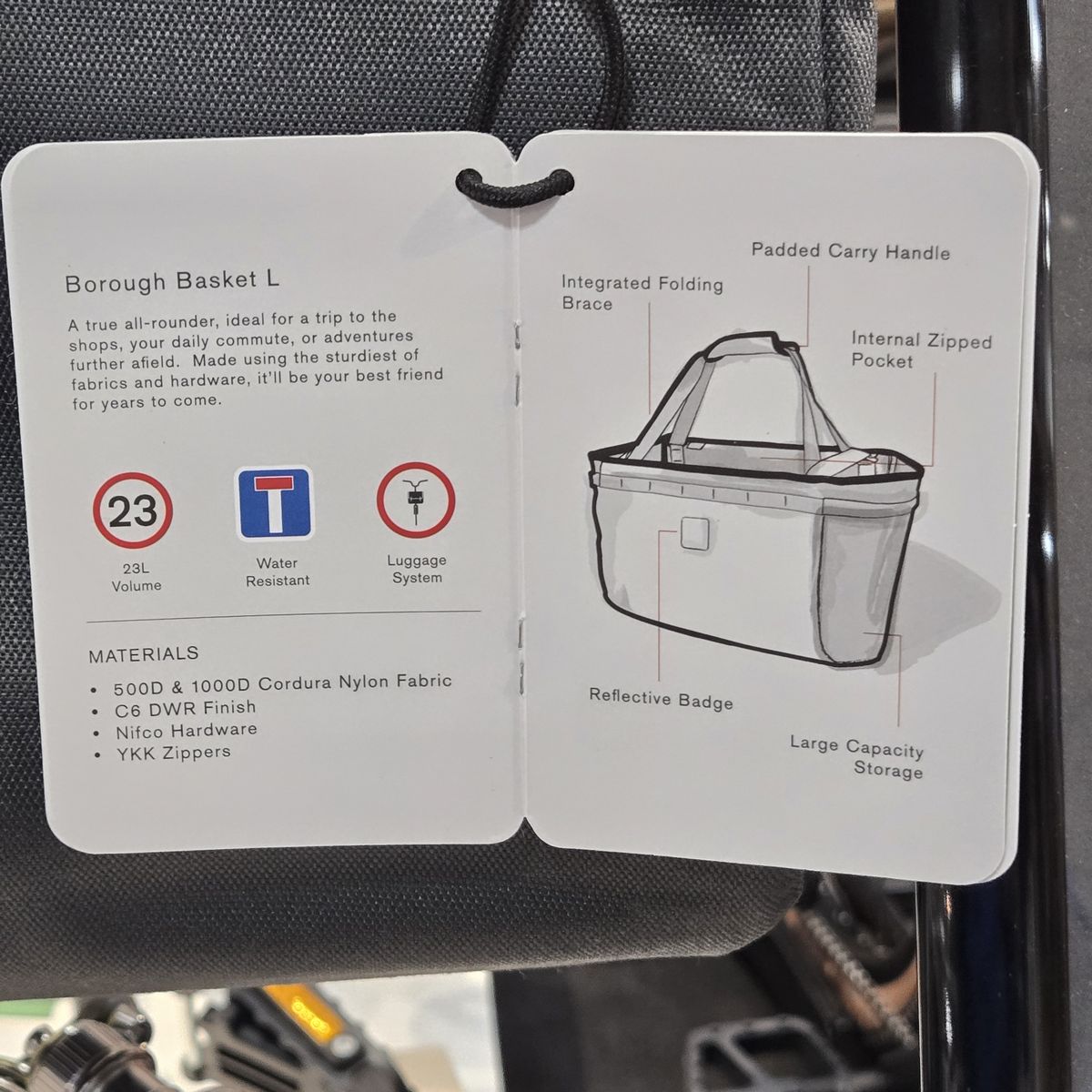 純正バッグには他にもザックタイプやメッセンジャーバッグタイプなど様々なラインナップがありますが、「Borough Basket Bag L」はシンプルに買い物用バスケットと形容するのが相応しい製品です。