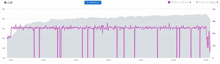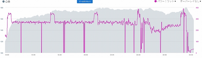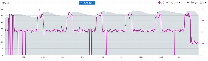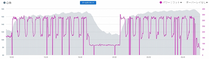 巡行と加速を繰り返すような負荷のかけ方で、それに連動して心拍も上下しています。