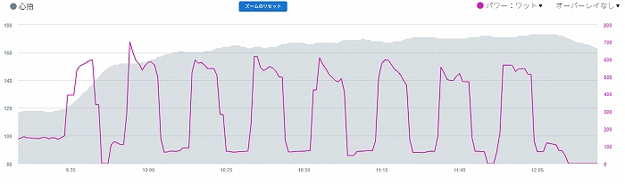 インターバルのタイミングで心拍がどんどん上がっているのがわかりますね。