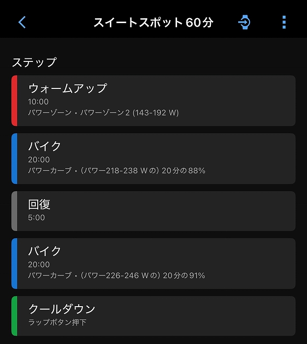 2分間FTPの85~95%、30秒FTP115~125%を10セット。