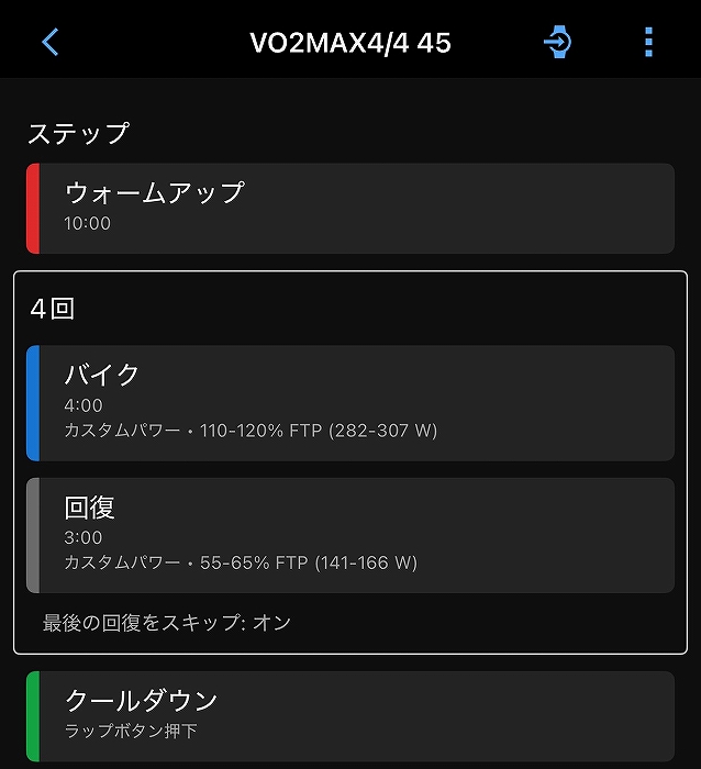実践に近いトレーニング負荷で、巡航ペースからインターバルを繰り返すので、FTPの向上や回復力の向上が見込めます。