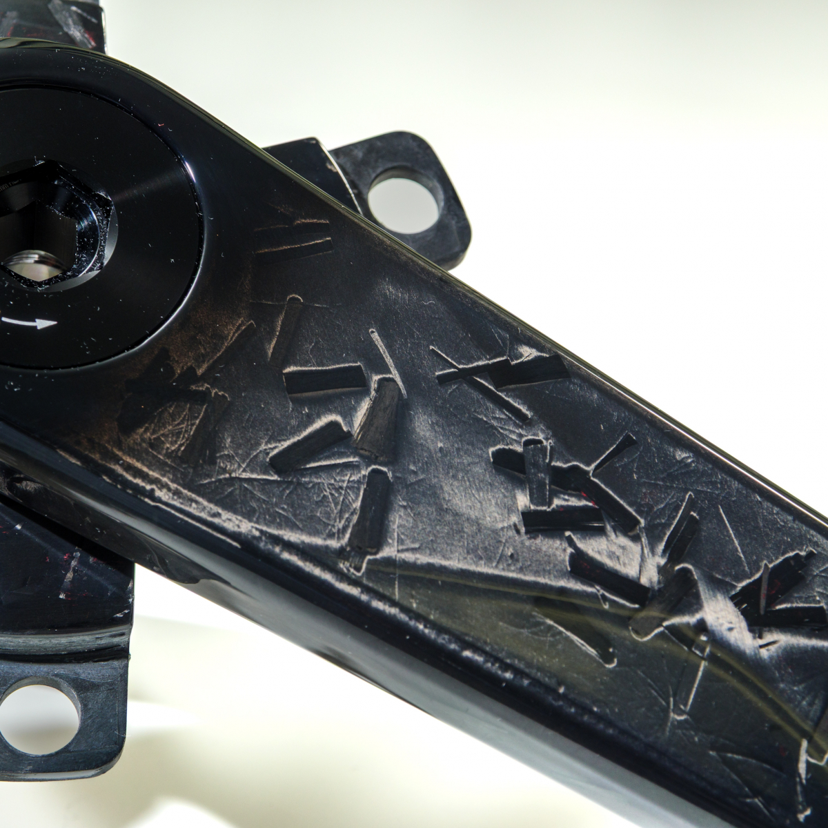 性能はもちろん、見た目の美しさにもこだわりました。カーボンクランクは平たんでシンプルなデザインが多いのですが、表面にうっすらとX状の盛り上がりがあり、また一般的には採用されていないマーブルカーボン+磨きの入ったツヤありクリアを採用。オリジナリティーかつ高級感がありつつ、バイクの足元をしっかりと引き締めます。