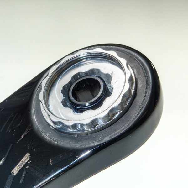 現在流通している多くのカーボンクランクに採用されているチタンスピンドルは外テーパータイプですが、今回採用しているのは加工精度が求められるインナーテーパー構造です。製造の手間は増えますが、その分、剛性バランスとパワー伝達性を高いレベルで両立できます。この部分が、クランク全体の性格を決めていると言っても過言ではありません。