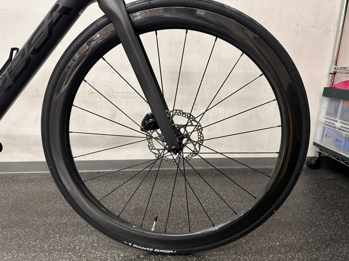 完成車に着いているホイール約2000gのホイールから1594gへと400g軽量化です。