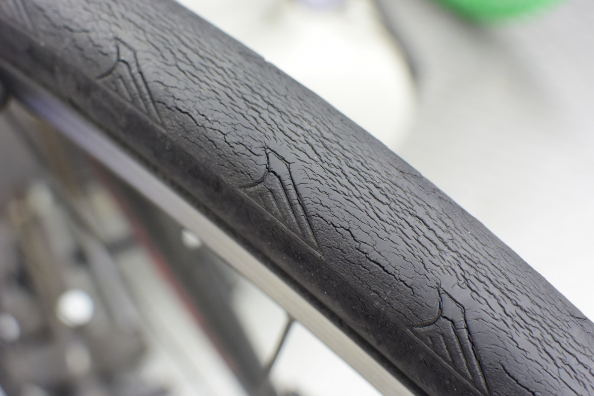 ヒビが出るという事は表面が硬くなっているという事なので、グリップや転がりなど性能はかなり下がっているはず。
