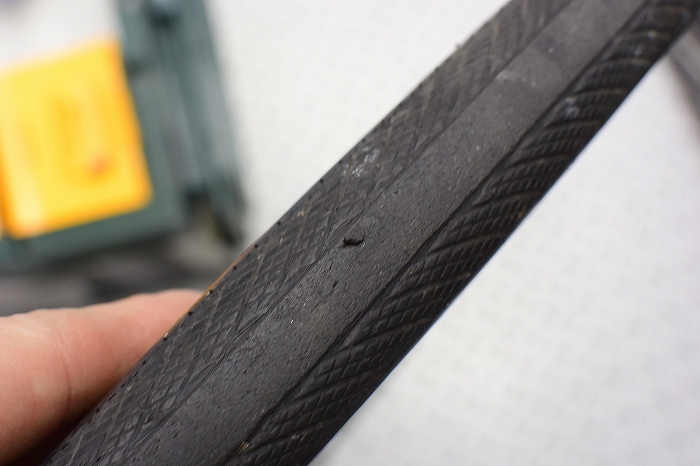 交換時期が近いタイヤ。元々は全体に溝がありましたが、走行面(中心部分)はすり減って溝が消えています。