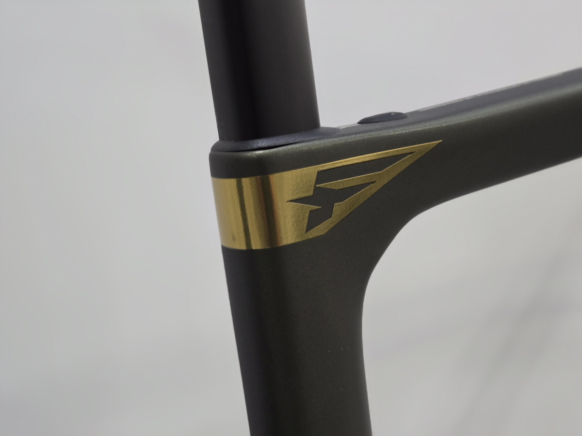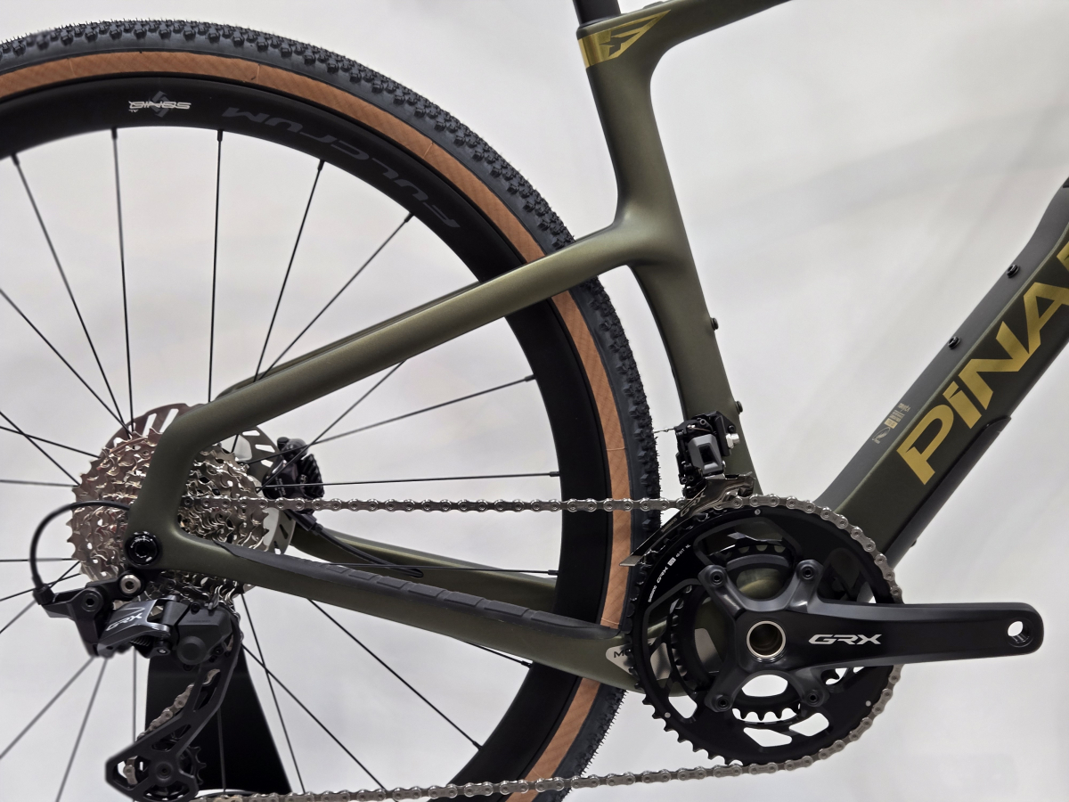 グラベルバイクらしい暗めのマットグリーンにロゴがメタリックのゴールドカラーという遊び心がありながらも高級感が漂うカラーリングになっています。