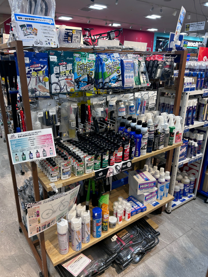 ワイズロード新橋店にはWAKO’Sの製品だけでなくMuc-offやSurLuster、FINISH LINEの製品も在庫として展示しているのでお好きなメーカーの製品を使って自分の自転車を綺麗にしましょう!