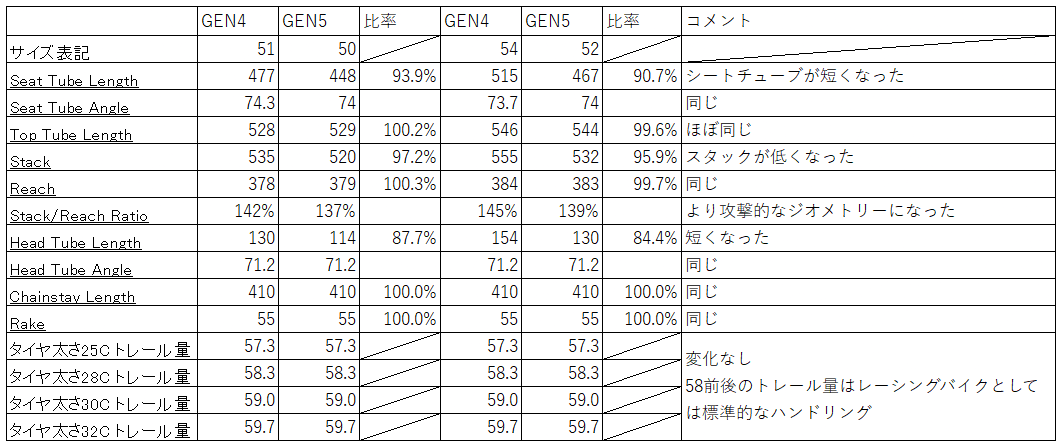 Gen5では同サイズ比較でスタックハイトが低くなりました。これにより前傾姿勢が取りやすくなり、近年主流のエアロポジションを作りやすくなっています。