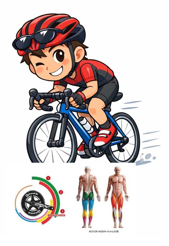 低ケイデンス:トルク増大、特定筋に依存し易い⇒大腿直筋、内側広筋などを使いすぎ/踏み込み主体になりやすかったりします。