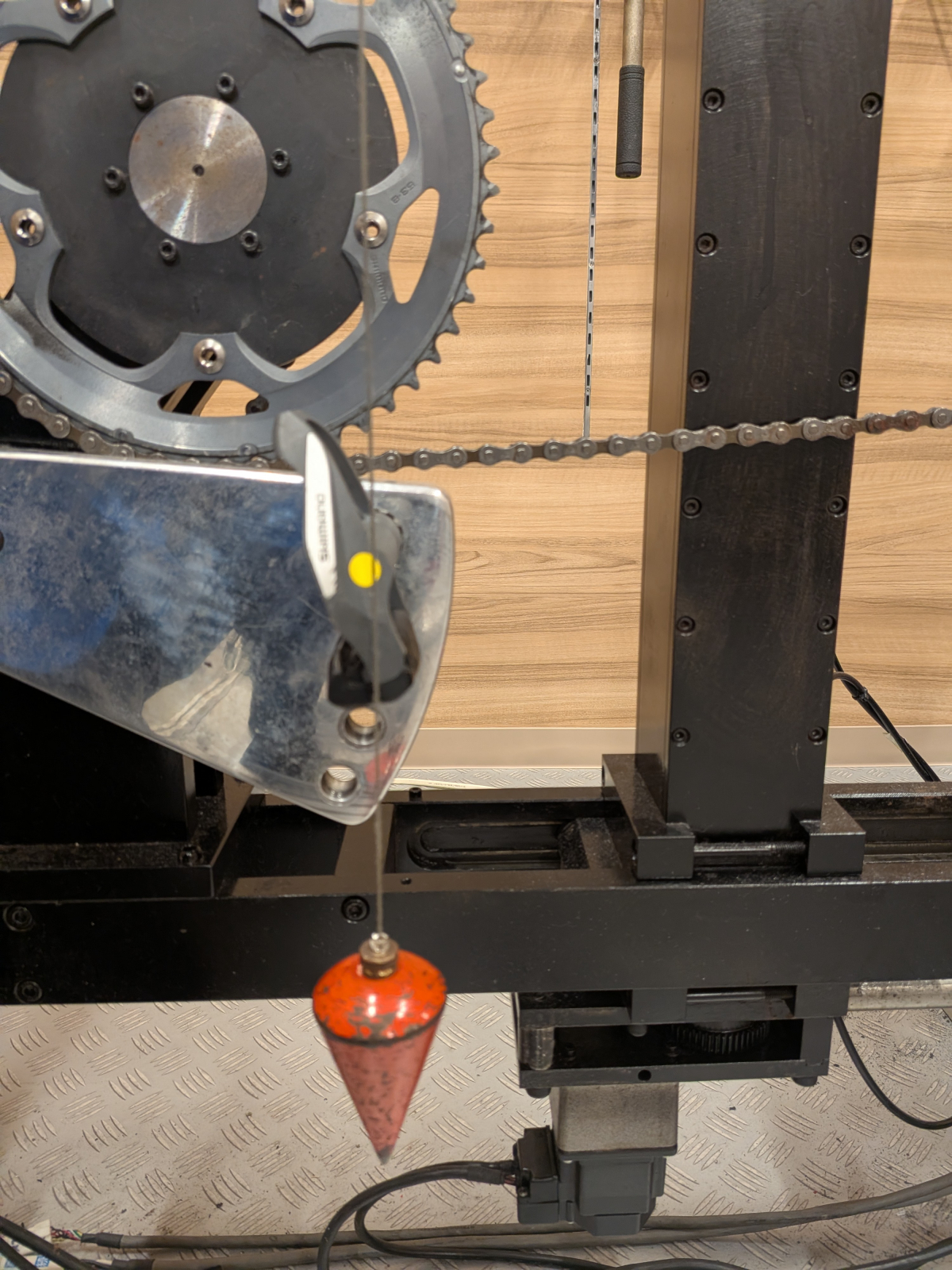 クランク水平にして膝からおもりの付いた糸を垂らして、ペダル軸チェック!