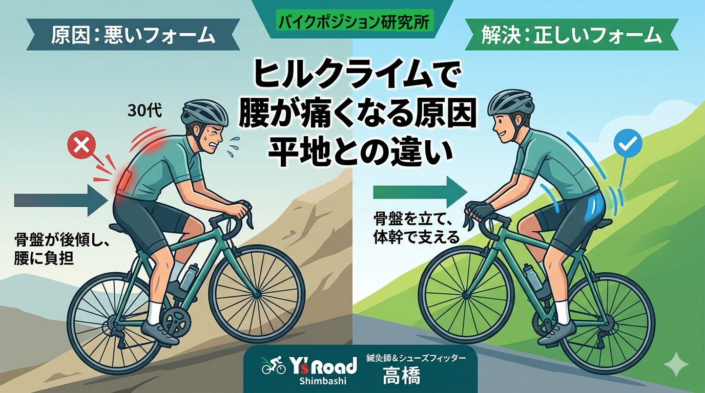 【腰痛対策】「初心者向け・ロングライド・ヒルクライム完全ガイド」坂道で腰が痛くなる原因は?平地との違いを知って「楽に速く」登るコツ