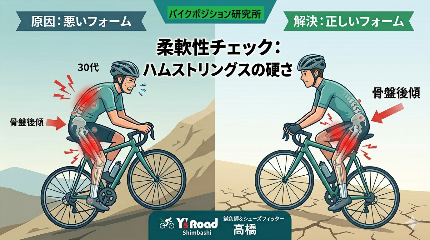 ​・ハムストリングスの硬さ: 腿裏が硬いと、前傾姿勢をとった際に骨盤が強制的に後ろへ引っ張られ、腰痛が出やすくなる