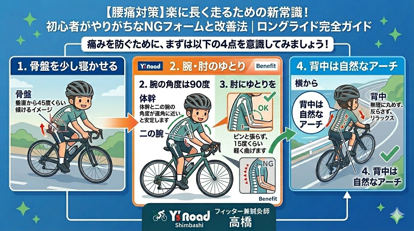 実は、自転車による腰痛の多くは、「姿勢(フォーム)」や「筋肉の強ばり」が原因です。今回は初心者の方が陥りがちな腰痛の改善ポイントをわかりやすくまとめました!