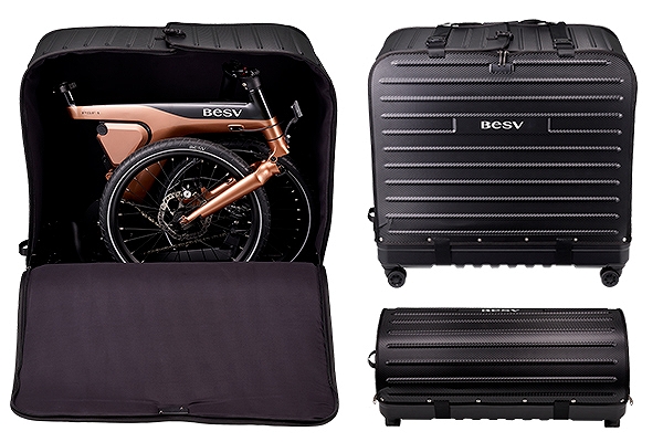 専用のキャリーケースはソフト/ハード2種類から選べます。ソフトキャリーケースはショルダーストラップ(別売)で背負うことができ、走行時はサドル下に装着できるので鉄道輪行に最適です。