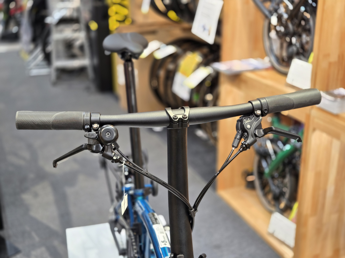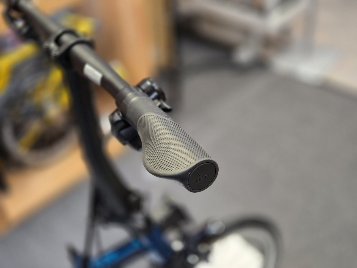 コチラはブロンプトン関わらず、フラットバーでは定番のカスタムで、手のひらの接地面積が広くなるので、手が痛くなりにくく快適性が向上してします。