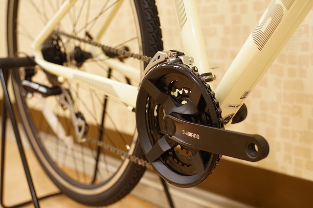 フロントアウターギアは42Tと軽めで荷物を載せた時にも軽い漕ぎ感を実現。