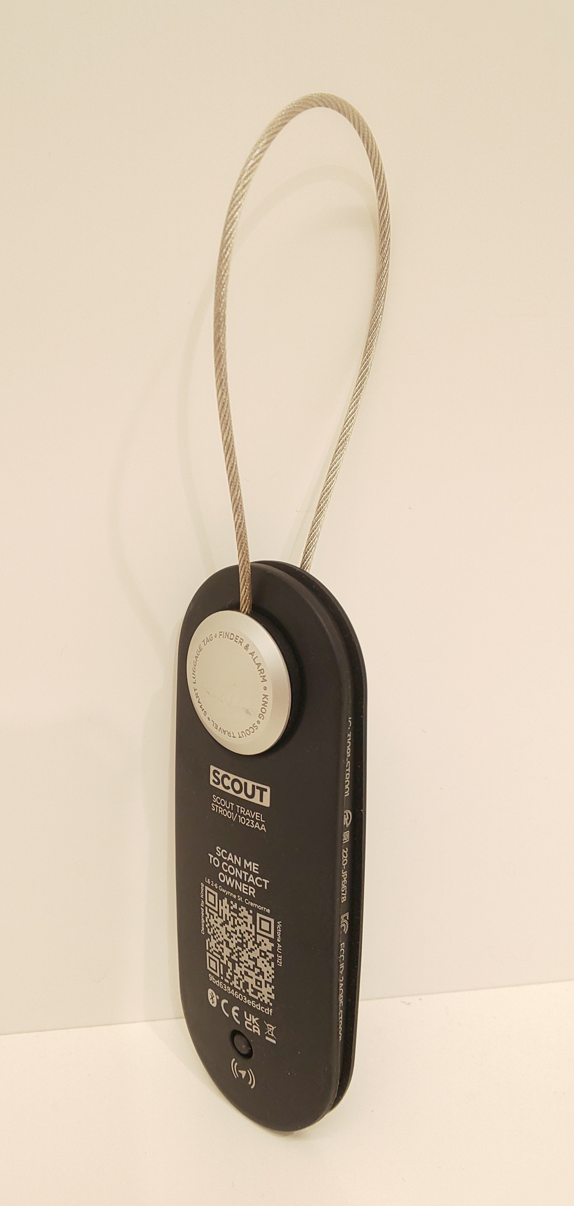 SCOUT TRAVELは名前のとおり旅行カバンやキャリーにも取付しやすい盗難防止アイテムです。使い方としてはそのまま荷物(バッグ内など)に入れる、SCOUT TRAVELに付属の専用セキュリティループ(ステンレスのケーブル)を使用してカバンやキャリー、自転車に提げる、本体の穴にケーブルロックを通して使うなど、様々なシチュエーションで使用できます。本体のQRコードを使用して所有者や連絡先をデジタル情報として保存ができ、トラベルタグとしても使えます。紛失や盗難された場合、QRコードを発見者が読み込む事で所有者に連絡ができます。また、本体を警戒モードに設定してBluetooth通信範囲内であれば移動を感知した際に85dbの大音量アラームでお知らせ、アプリへ移動を感知した事を通知します。使用時の最大稼働時間は約2カ月ですが、アプリ使用時に充電残量を確認してお使いください。