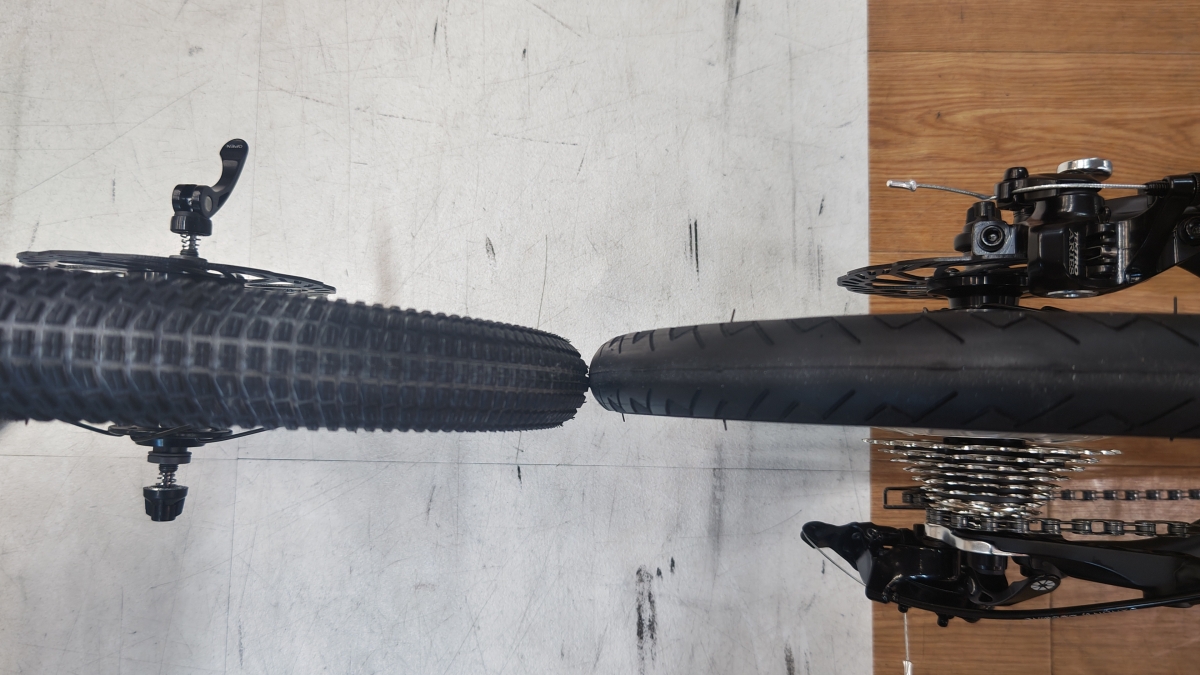 ちなみに上から比べるとこんな感じ。空気圧をMAXまで入れていないのでまるっきり違うとは言えませんが、少し太くなっているのがこれでもわかるかと思います。タイヤが太くなることで得られる効果として、安定感が増す、エアボリュームが大きくなることでクッション性が増すなどのメリットがあります。