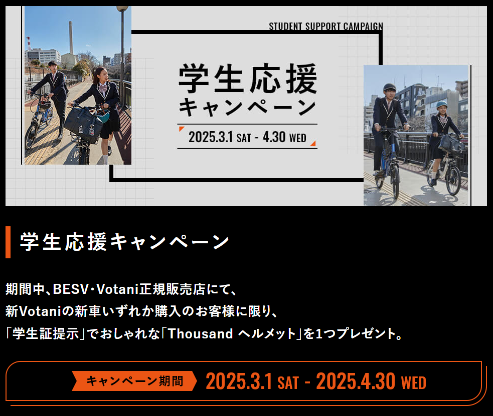 VOTANIの新車をご購入の学生さん向けのキャンペーンとなります。店頭にて学生証の提示をして頂ければ今や努力義務ともなったヘルメットをプレゼントさせていただきます。選べるヘルメットの種類については店頭にてお問い合わせ下さい。
