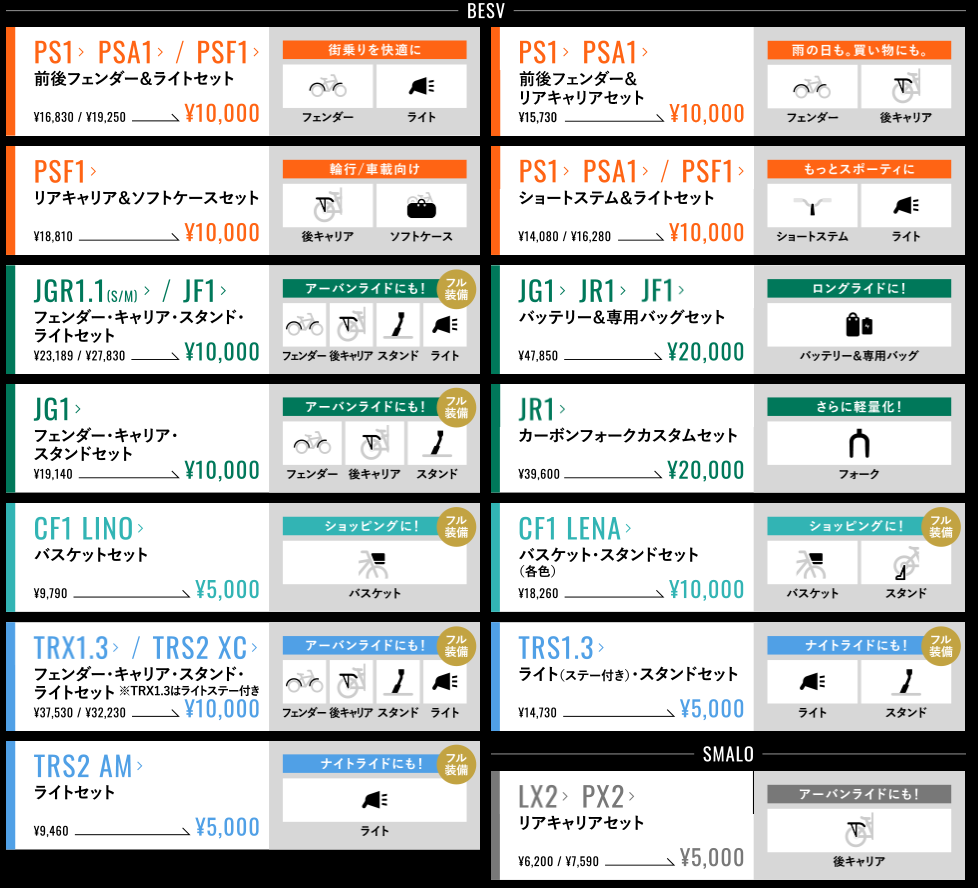 PSシリーズの前後フェンダー&ライトセットは当店でも一番選ばれる内容。その他にもJF-1のフェンダー・ライト・スタンド・キャリアセットもオススメです。セットに含まれない商品も注文&取付けは可能ですのでご希望の場合はスタッフまでお問い合わせ下さい。